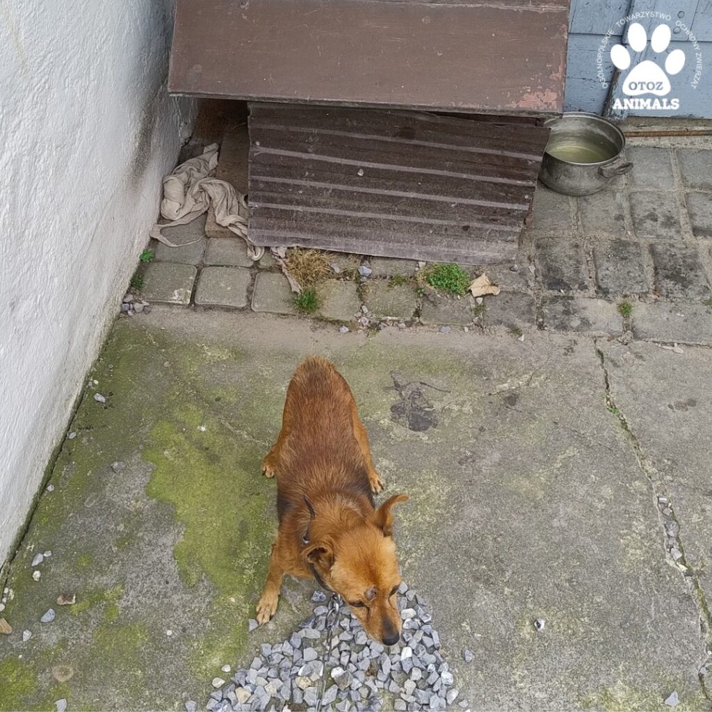 Na jednej z posesji stała zrujnowana i pokryta pajęczynami buda, a jej wejście było zwrócone w stronę ściany, jakby ktoś chciał ukryć istnienie psa, który był do niej przykuty łańcuchem. W środku budy znajdowały się stare szmaty, a w garnku, który stał obok, była brudna woda ze śmieciami. W takich warunkach musiała wegetować Mika.