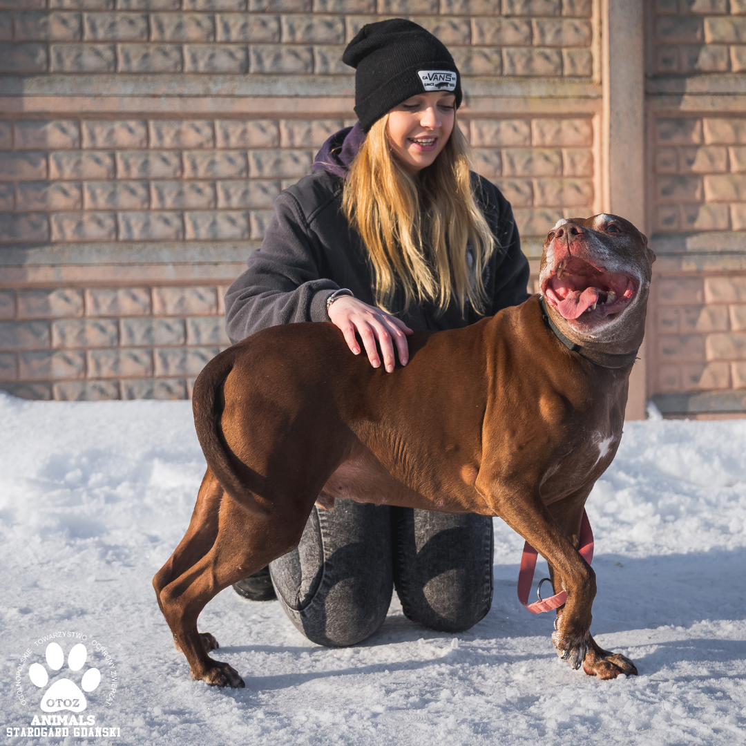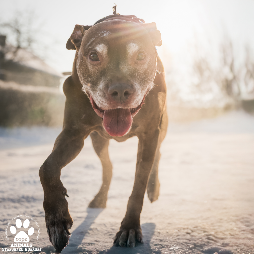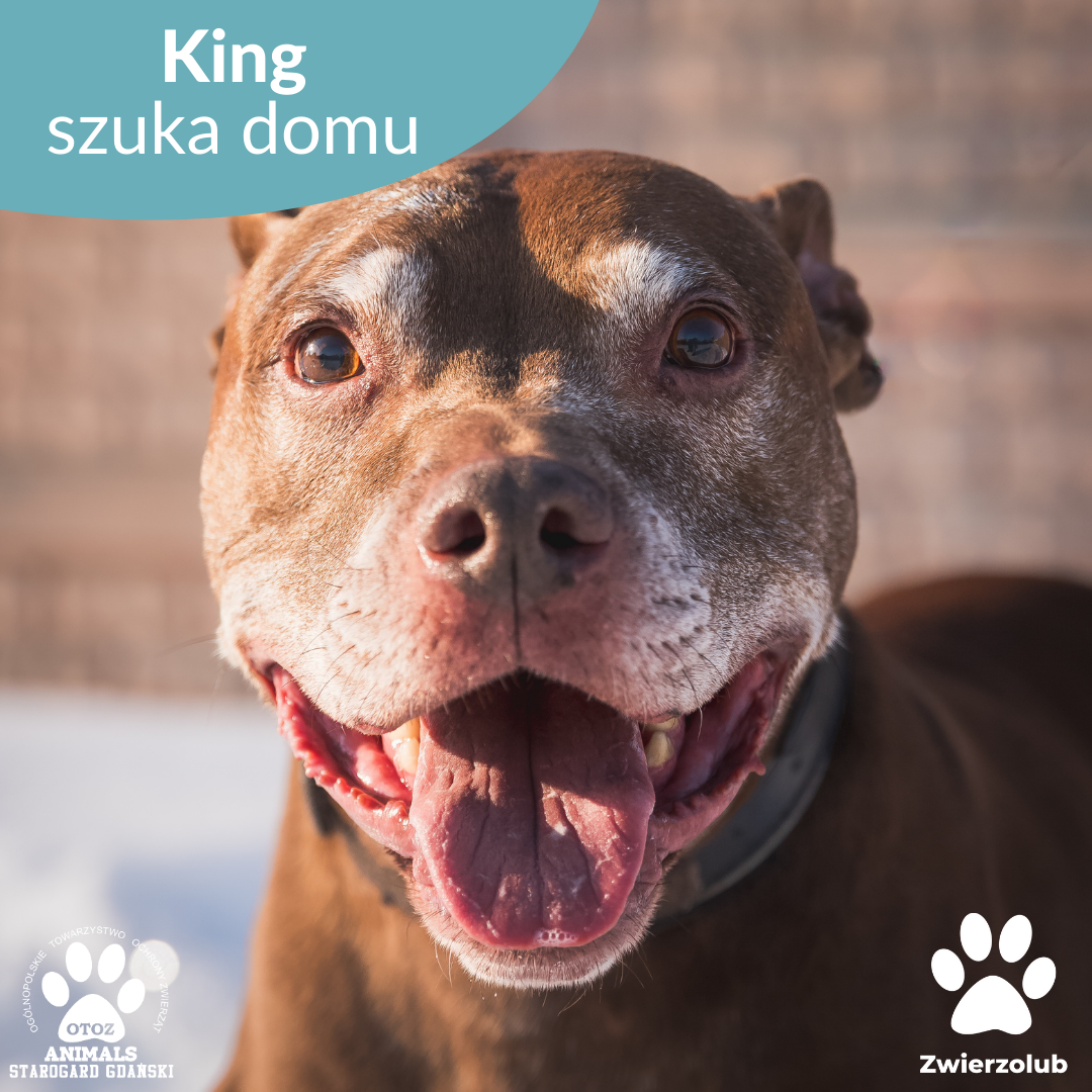 King to psiak w typie amstaffa o wielkim sercu i jeszcze większej potrzebie bliskości. Choć jego postura może budzić respekt, w rzeczywistości jest bardzo przyjazny i otwarty na kontakt z człowiekiem.