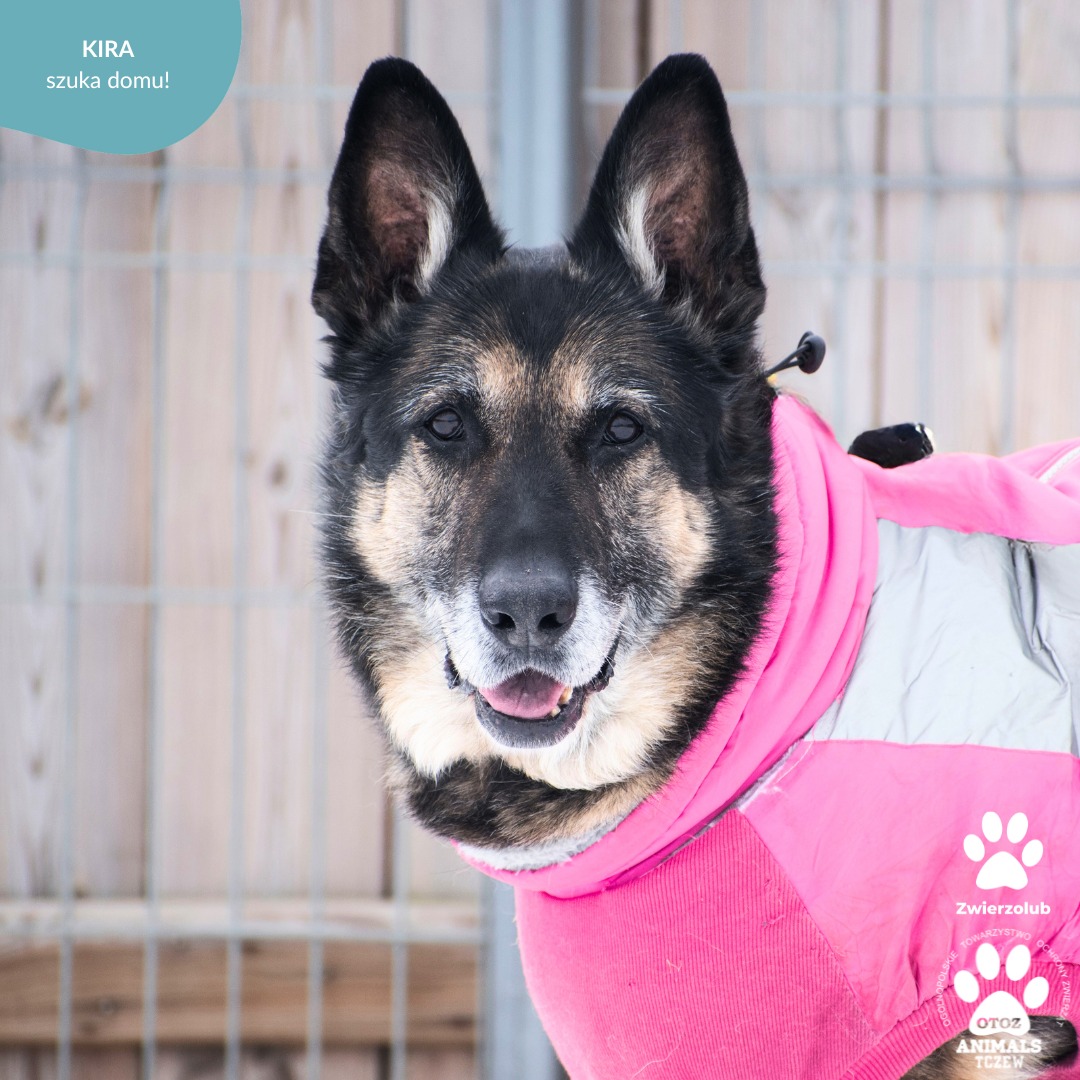 Kira to suczka w wieku około 11 lat i wadze 28 kg. Jest sympatyczna i bardzo pozytywnie nastawiona do człowieka – szczególnie gdy w grę wchodzą smaczki, do których ma wyraźną słabość. Mogłaby zamieszkać z łagodnym samcem. Mimo wieku wciąż ma sporo siły i energii, a na spacerach potrafi ciągnąć, dlatego wymaga dalszej pracy nad spokojnym chodzeniem na smyczy.