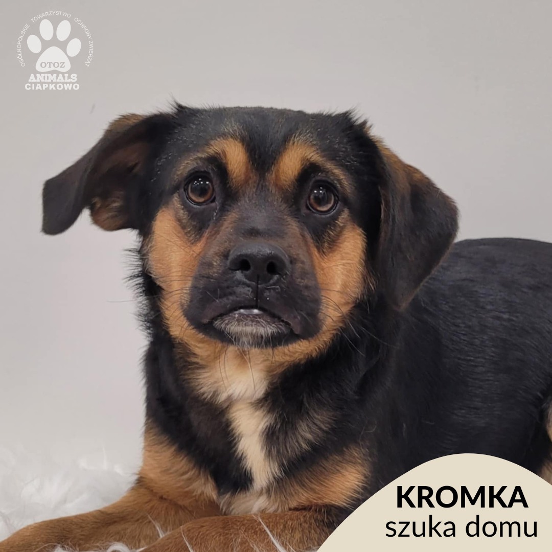 KROMKA jest młodą, energiczną, ale nieśmiałą suczką. Do schroniska trafiła 14 listopada 2025 roku, została odebrana przez inspektorów OTOZ Animals ze złych warunków razem ze swoją mamą i rodzeństwem. Ze względu na braki w socjalizacji i wychowaniu potrzebuje czasu i cierpliwości. W pierwszym kontakcie z nowymi osobami zachowuje dystans.